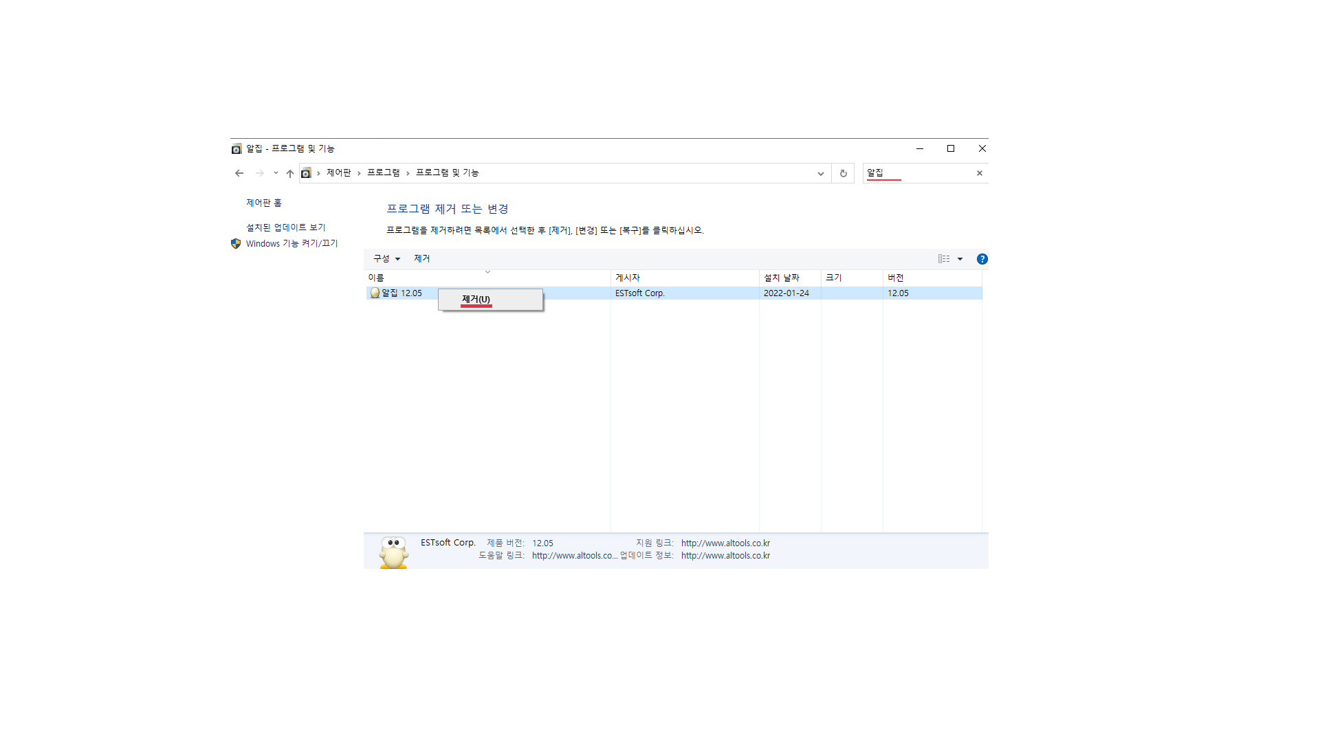 검색창에 알집을 검색 후 제거해주세요.